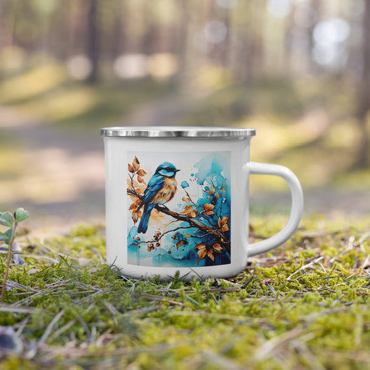 Blue and Tan Bird Perched Enamel Mug (12 oz)