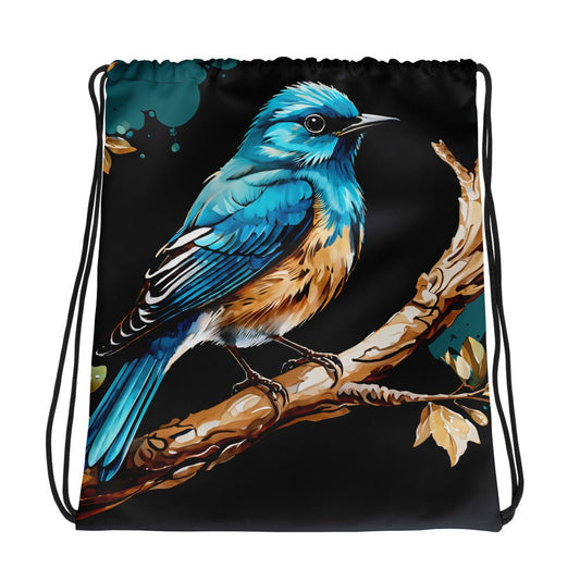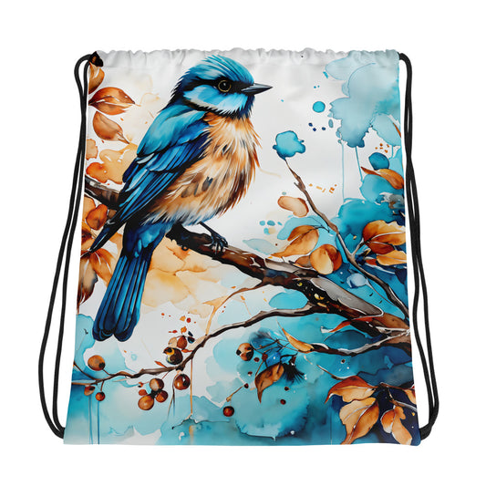 Blue and Tan Bird Perched Watercolor Art Drawstring Bag