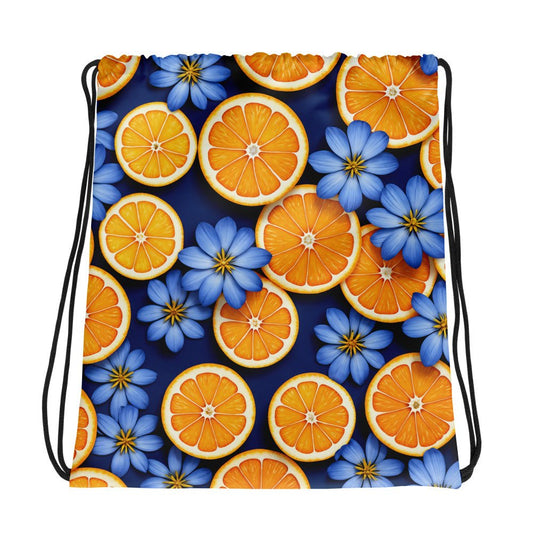 Blue Flowers And Oranges Drawstring Bag