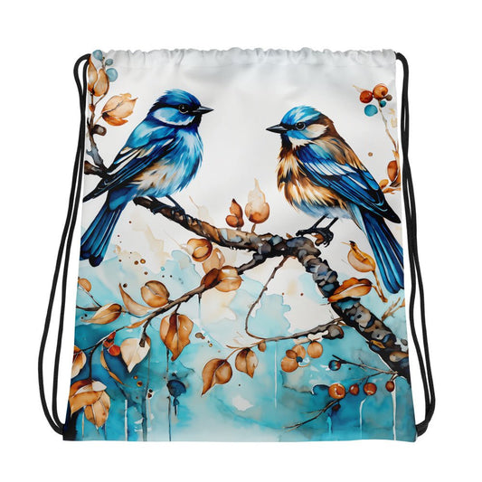 Blue Watercolor Birds Drawstring Bag
