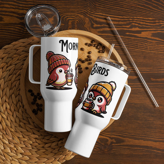Morning Birds (Tan) Travel Mug With Handle (25 oz and 40 oz)