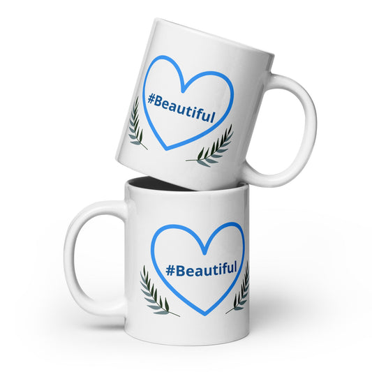 #Beautiful Blue Heart With Leaves White Glossy Mug (11 oz, 15 oz, 20 oz)