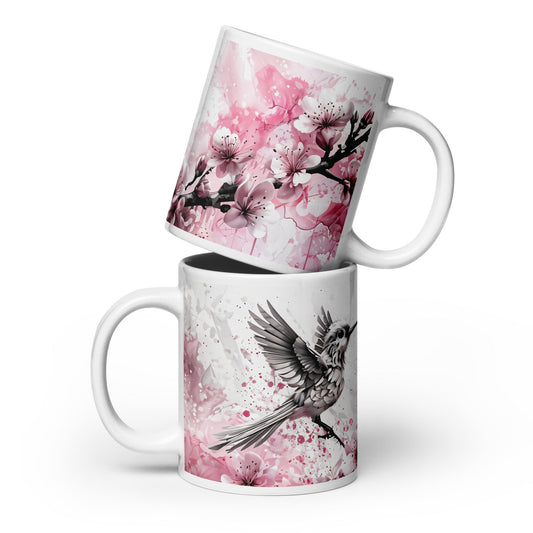 Bird On Cherry Blossom Branch White Glossy Mug (11 oz, 15 oz, 20 oz)