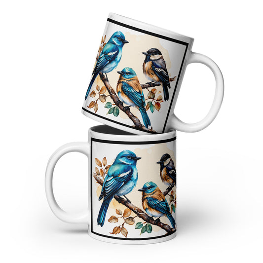 Blue and Tan Bird Perched White Glossy Mug (11 oz, 15 oz, 20 oz)