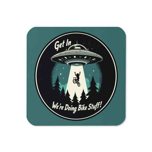 Mountain Biker-UFO Abduction "Get In-We're Doing Bike Stuff!" Cork-Back Coaster