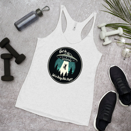 Mountain Biker-UFO Abduction "Get In-We're Doing Bike Stuff!" Women's Racerback Tank
