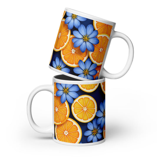 Blue Flowers and Oranges White Glossy Mug (11 oz, 15 oz, 20 oz)